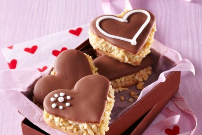 Priprema: Samleti smokve, suvo grožđe, orahe, dodati malo oraščića i cimeta i na kraju gust sirup skuvan od šećera sa malo vode i 50 gr istopljene čokolade. Masu dobro izraditi rukom, pa rastanjiti na celofanu na debljinu od 0.8 mm, pa modlom u obliku srca vaditi kolačiće i ređati na tacnu sa pek papirom. Ostaviti da se prosuše, pa ih prelivati glazurom od čokolade i ukrasiti.