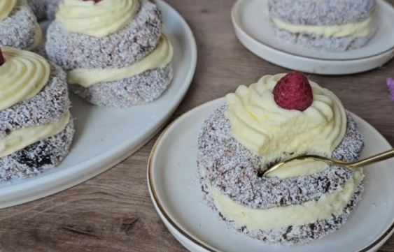 Izvadite kolač iz čaše, pa uvaljajte u kokos i isecite na 3 koluta. Poređajte kolutove na tacnu, preko sipajte slatku pavlaku koju ste umutili sa vanilom i preklopite preostalim čokoladnim kolutovima. Ponovo sipajte umućenu slatku pavlaku, pa ukrasite po želji i služite.