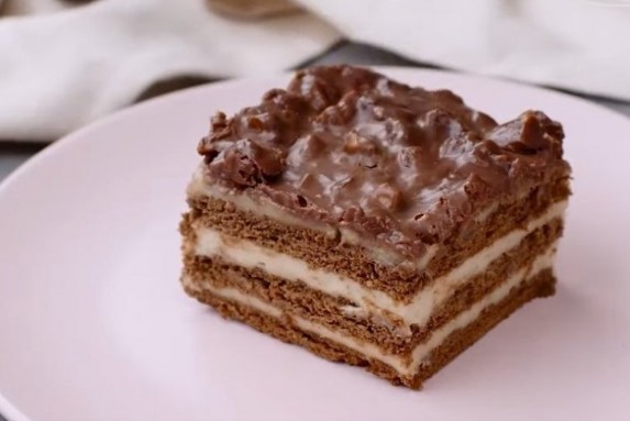 Poređajte čokoladni keks u jednom redu po dnu kalupa za pečenje. Premažite pripremljenom kremastom mešavinom. Ponovite postupak sa još dva sloja keksa i krema. Da biste napravili preliv, istopite čokoladu i slatku pavlaku, a zatim umešajte lešnike.