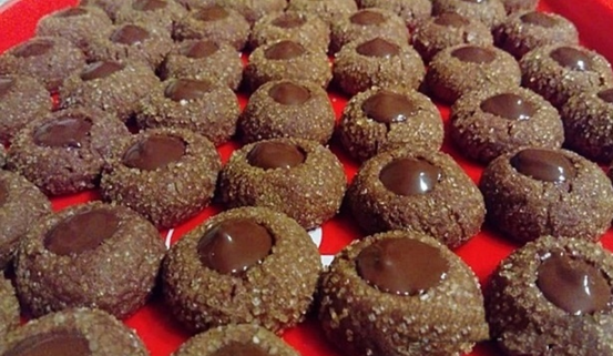 Svaku kuglicu uvaljati u krupni smeđi šećer (najbolje Demerara), može i u bijeli, vjerujem da bi se dobio sličan efekt.Svaku kuglicu pritisnuti drškom drvene kuhače da se napravi udubina. Peći ih 10-ak minuta na 140-150 C, odnosno kako već pečete keksiće.