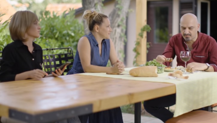 Na snimci vidimo kako jedna crnogorska obitelj ruča za stolom ispred kuće, a baka s vizirom štrika pokraj njih.