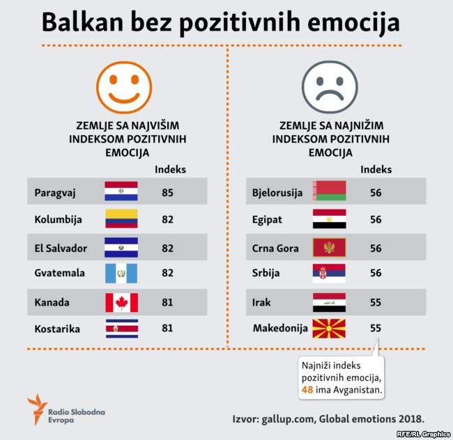 Da građani ove zemlje ne pršte od pozitivnih vibracija, pokazalo je i Galupovo istraživanje globalnih emocija za 2017. godinu. Na Galupovoj listi zemlje Zapadnog Balkana su svrstane među države sa najnižim indeksom pozitivnih emocija.
