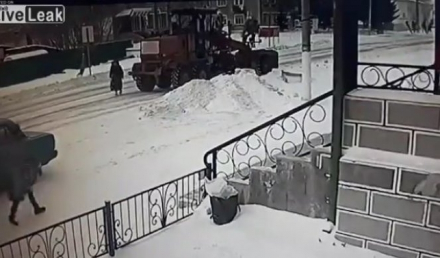 Video prikazuje ženu koja obilazi grtalicu, a onda u trenutku kada se nalazi iza vozila dešava drama.