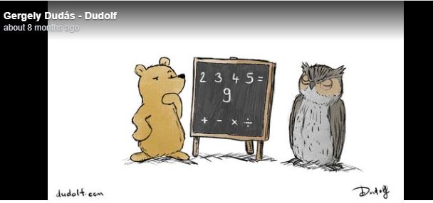Dudolf je nacrtao medveda kako stoji zbunjen ispred table na kojoj su nacrtani brojevi i matematičke operacije sabiranje, oduzimanje, množenje, deljenje, a mudra sova pored strpljivo čeka rešenje.
