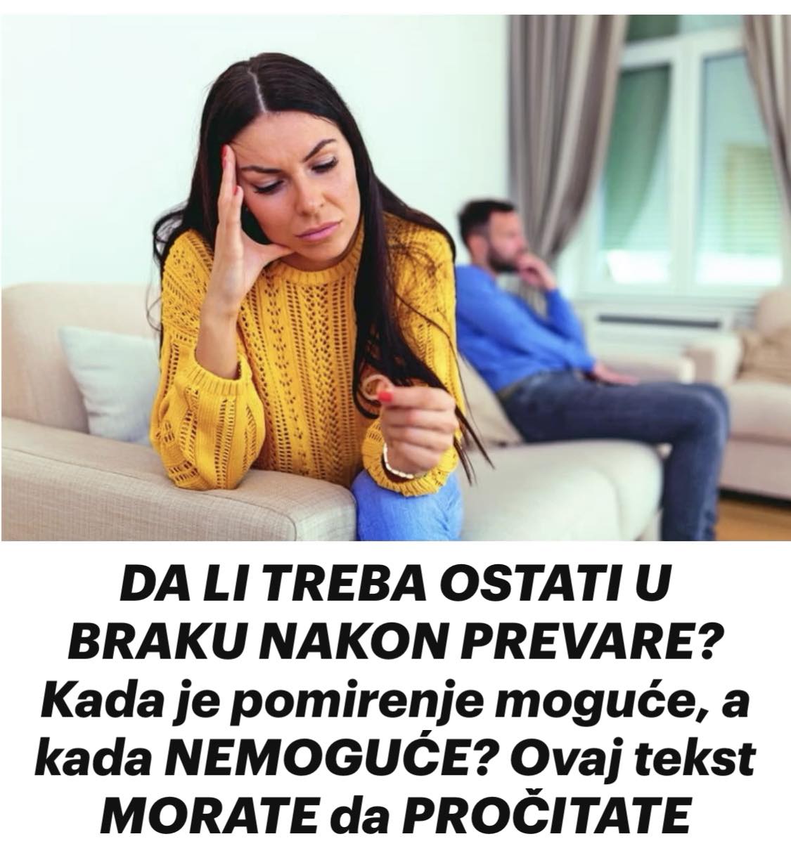 Suočavanje s prevarom muža ili žene jedan je od najtraumatičnijih događaja u životu. Neko od njih je živeo “u slepilu” i nije primećivao znake da se onaj drugi ne ponaša uobičajeno. Saznanje o neverstvu prate najpre ljutnja i bes, zatim šok i neverica, a za njima stižu dugotrajnije emocije kao što su osećaj krivice, tuga, poniženje, neprekidno vraćanje filma i na kraju – depresija. Do juče je jedno od njih bilo uljuljkano u sigurnost i toplinu braka, a već sutra sve je postalo laž u kojoj su živeli. Teško je prihvatiti da se svet ruši. Prevara ne mora da znači kraj ljubavi, ali može da donese kraj braka. A pitanje koje se nakon svega nameće je kako nakon izdaje nastaviti bračnu zajednicu i kako će ubuduće izgledati takav život. Sve zavisi od dogovora partnera, ali i načina na koji je do prevare došlo.