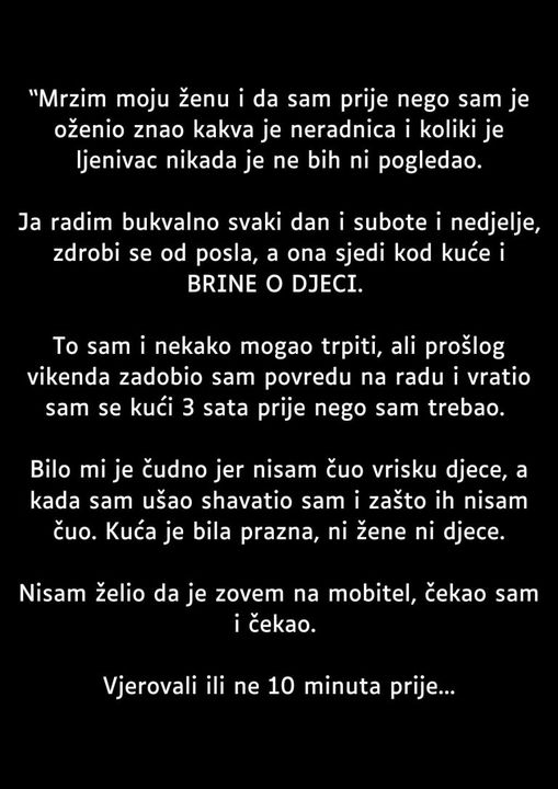 To sam i nekako mogao trpiti, ali prošlog vikenda zadobio sam povredu na radu i vratio sam se kući 3 sata prije nego sam trebao. Bilo mi je čudno jer nisam čuo vrisku djece, a kada sam ušao shavatio sam i zašto ih nisam čuo. Kuća je bila prazna, ni žene ni djece.