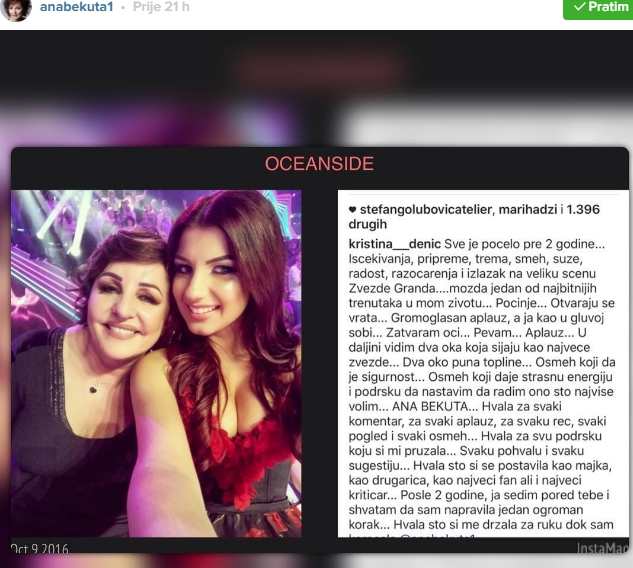 Legendarna srbijanska pjevačica Ana Bekuta, podijelila je dirljiv post prošlogodišnje takmičarke “Zvezda Granda” i zahvalila joj se riječima koje su oduševile njene pratioce. Mlada Kristina napisala je da joj je tokom takmičenja Ana davala najveću podršku od svih članova žirija i da joj je čast što je jedna takva veličina vjerovala u nju.