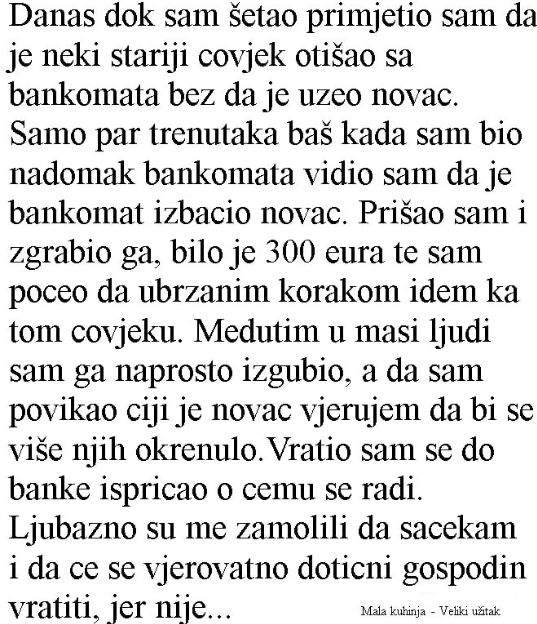 Samo par trenutaka baš kada sam bio nadomak bankomata vidio sam da je bankomat izbacio novac. Prišao sam i zgrabio ga, bilo je 300 eura te sam počeo da ubrzanim korakom idem ka tom čovjeku. Međutim u masi ljudi sam ga naprosto izgubio, a da sam povikao čiji je novac vjerujem da bi se više njih okrenulo.