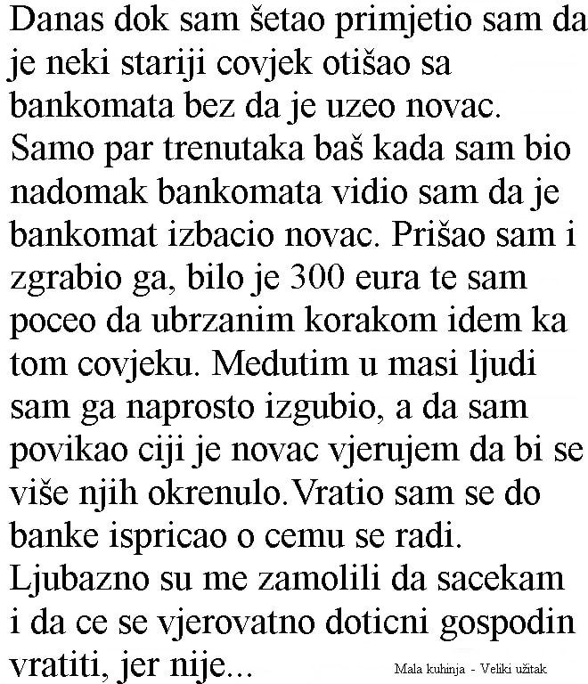 Danas dok sam šetao primjetio sam da je neki stariji čovjek otišao sa bankomata bez da je uzeo novac.Samo par trenutaka baš kada sam bio nadomak bankomata vidio sam da je bankomat izbacio novac. Prišao sam i zgrabio ga, bilo je 300 eura te sam počeo da ubrzanim korakom idem ka tom čovjeku. Međutim u masi ljudi sam ga naprosto izgubio, a da sam povikao čiji je novac vjerujem da bi se više njih okrenulo.