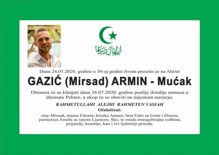 Arminu Gaziću danas će biti klanjana dženaza-namaz u njegovoj rodnoj Zenici, u džematu Pehare poslije ikindije namaza. Bit će ukopan na mjesnom mezarju.