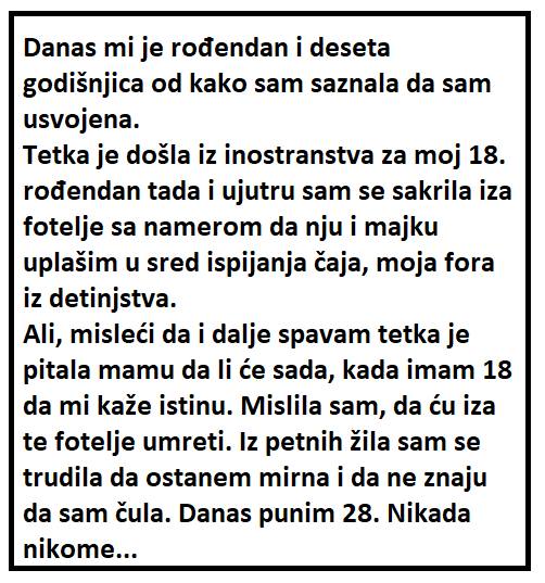 Danas mi je rođendan i deseta godišnjica od kako sam saznala da sam usvojena. Tetka je došla iz inostranstva za moj 18. rođendan tada i ujutru sam se sakrila iza fotelje sa namerom da nju i majku uplašim u sred ispijanja čaja, moja fora iz detinjstva. Ali, misleći da i dalje spavam tetka je pitala mamu da li će sada, kada imam 18 da mi kaže istinu. Mislila sam, da ću iza te fotelje umreti. Iz petnih žila sam se trudila da ostanem mirna i da ne znaju da sam čula. Danas punim 28. Nikada nikome nisam rekla da znam da sam usvojena. I nikada se nisam naljutila na roditelje što mi nisu rekli. Dugo sam provodeći vreme sa njima gledala u njih, mirna, jer znam da su imali dobru nameru.