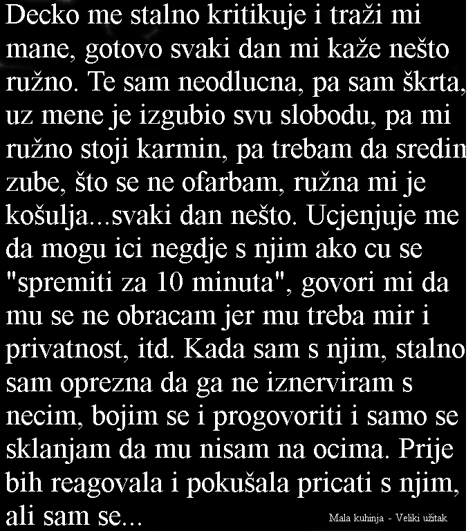 Dečko me stalno kritikuje i traži mi mane, gotovo svaki dan mi kaže nešto ružno. Te sam neodlučna, pa sam škrta, uz mene je izgubio svu slobodu, pa mi ružno stoji karmin, pa trebam da sredim zube, što se ne ofarbam, ružna mi je košulja…svaki dan nešto. Ucjenjuje me da mogu ići negdje s njim ako ću se “spremiti za 10 minuta”, govori mi da mu se ne obraćam jer mu treba mir i privatnost, itd.