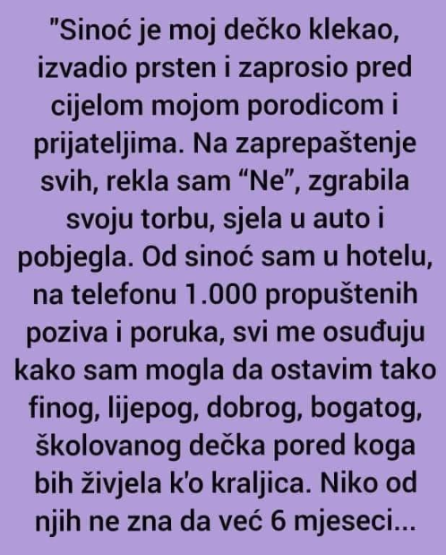 “Sinoć je moj dečko klekao, izvadio prsten i zaprosio pred cijelom mojom porodicom i prijateljima. Na zaprepaštenje svih, rekla sam “Ne”, zgrabila svoju torbu, sjela u auto i pobjegla.