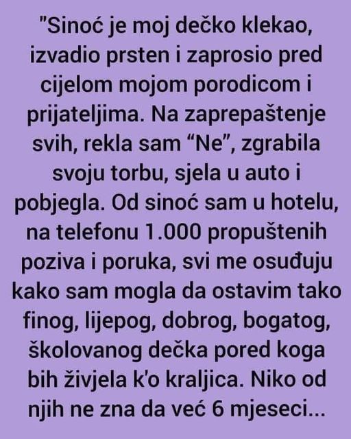 “Sinoć je moj dečko klekao, izvadio prsten i zaprosio pred cijelom mojom porodicom i prijateljima. Na zaprepaštenje svih, rekla sam “Ne”, zgrabila svoju torbu, sjela u auto i pobjegla.