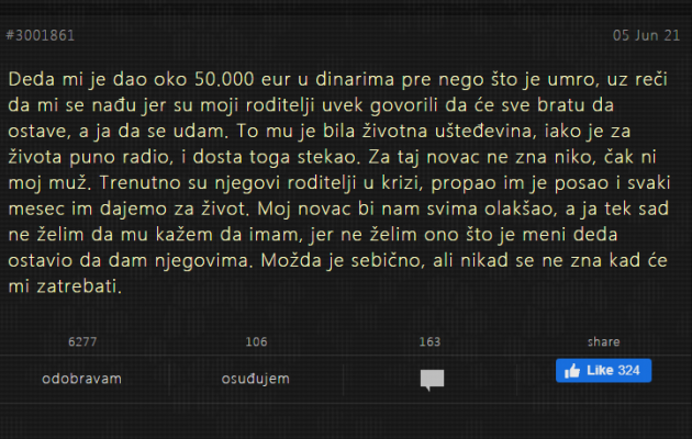“Deda mi je dao oko 50.000 eur u dinarima prije nego što je umro, uz riječi da mi se nađu jer su moji roditelji uvijek govorili da će sve bratu da ostave, a ja da se udam.