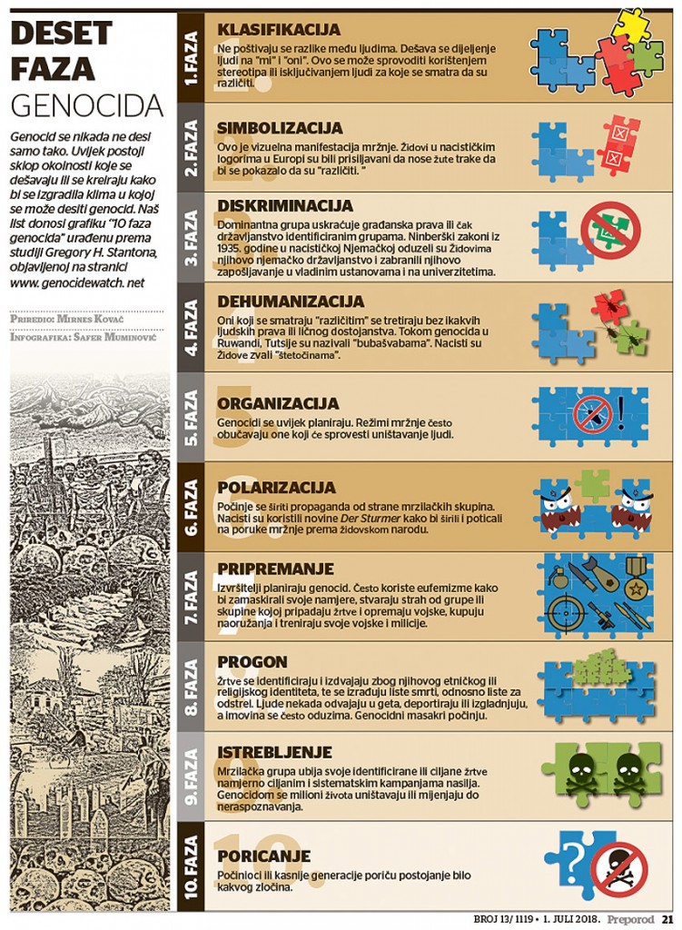 Genocid se nikada ne desi samo tako. Uvijek postoji sklop okolnosti koje se dešavaju ili se kreiraju kako bi se izgradila klima u kojoj se može desiti genocid. Donosimo grafiku “10 faza genocida” urađenu prema studiji Gregory H. Stantona, objavljenoj na stranici: