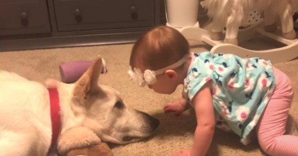 Budući da još ne mogu pričati, djeca svoju ljubav iskazuju dodirom. Mnogo puta oni pokušaju zagrliti ili poljubiti ljude i životinje kako bi im pokazali da ih smatraju posebnima i da ih vole. Ova djevojčica je bila potpuno očarana obiteljskim psom te mu je htjela to poljupcima pokazati.