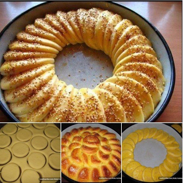 3.Testo vaditi casom kao za krofne i redjati u dublju tepsiju ili serpu,tako da svaki krug legne na polovinu prethodnog,a izmedju kako stavljate koji krug testa,odmah stavljate i fil.