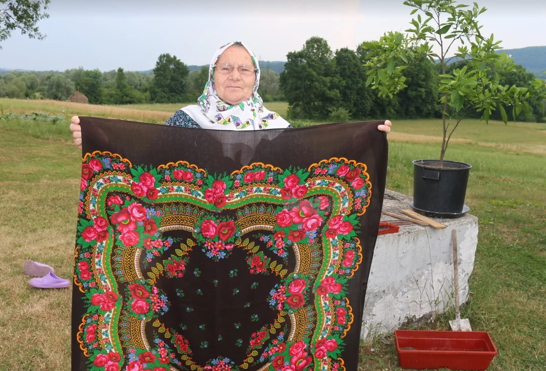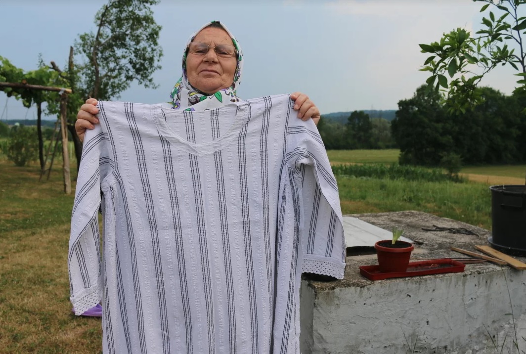 Pokazuje nam košulju koju su žene nekada oblačile, a koju više niko ne nosi. Kaže da je stara preko 100 godina i ručno sašivena. Iz svoje stare kuće iznosi i crni rubac sa šarenim detaljima, za kojeg reče da se zove mukadem i kojeg su žene zavijale preko glava.