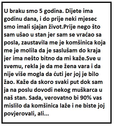 U braku smo 5 godina. Dijete ima godinu dana, i do prije neki mjesec smo imali sjajan život.Prije nego što sam ušao u stan jer sam se vraćao sa posla, zaustavila me je komšinica koja me je molila da je saslušam do kraja jer ima nešto bitno da mi kaže.Sve u svemu, rekla je da me žena vara i da nije više mogla da ćuti jer joj je bilo žao. Kaže da skoro svaki put dok sam ja na poslu dovodi nekog muškarca u naš stan. Sada, verovatno bi 90% vas mislilo da komšinica laže i ne biste joj povjerovali, ali ja jesam.