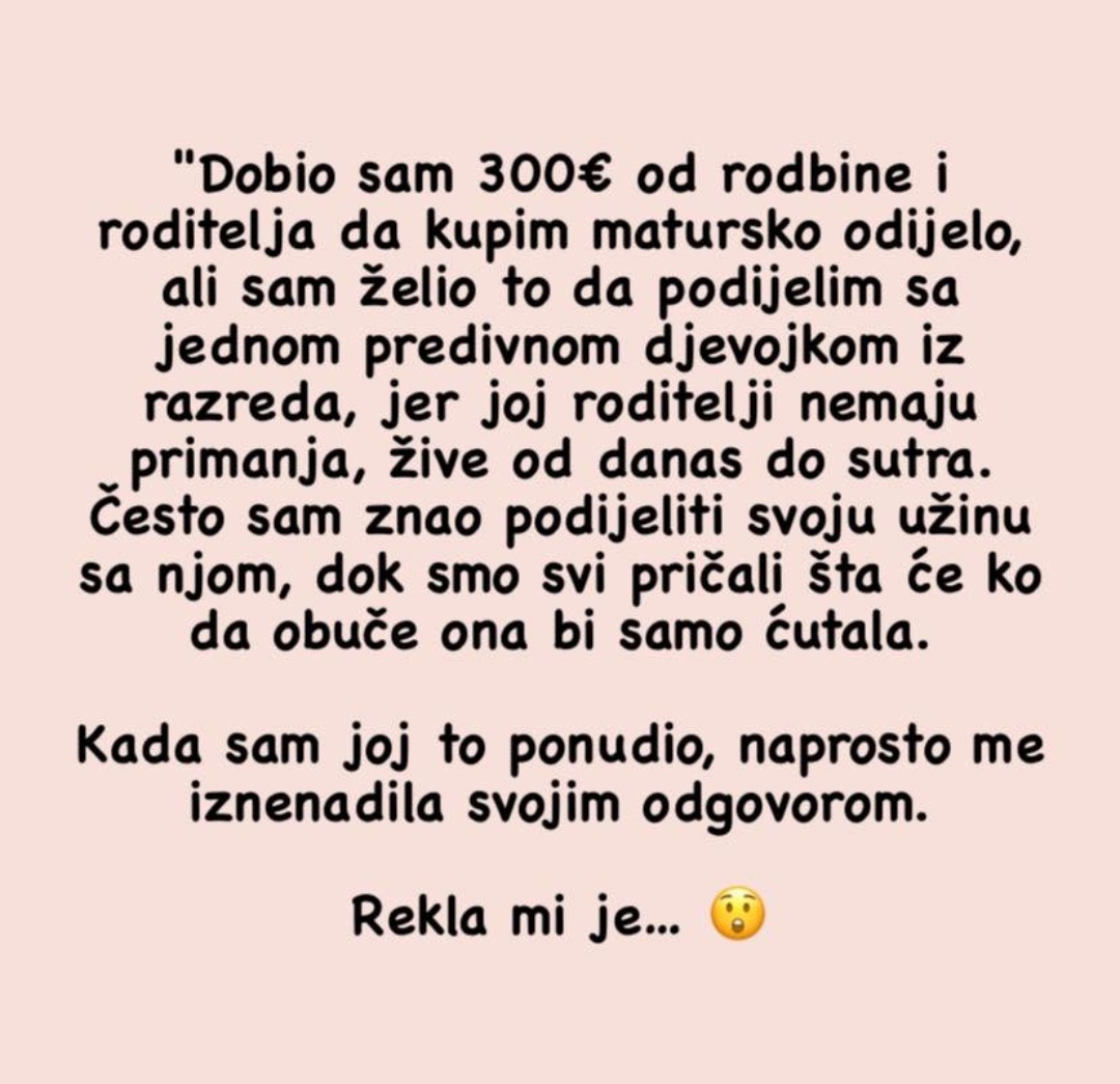 Dobio sam 300 eura od roditelja i rodbine da kupim sebi matursko odelo,ali sam ipak želio da to podelim sa jednom predivnom devojkom iz svog razreda,jer joj roditelji nemaju neka primanja, žive od danas do sutra.