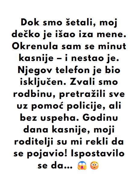 Dok smo šetali, moj dečko je išao iza mene. Okrenula sam se minut kasnije – i njega nije bilo. Njegov telefon je bio isključen. Zvali smo rodbinu, tražili ga uz pomoć policije, ali bez uspeha. Godinu dana kasnije, moji roditelji su mi rekli da se pojavio! Ispostavilo se da mu je jednostavno svega bilo dosta i odlučio je da promeni svoj život iz korena.