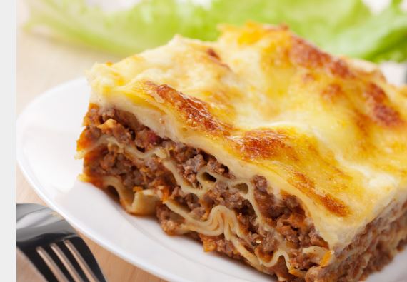 Priprema:Na ulju dinstajte nasjeckani luk, dodajte meso i prepecite sa svih strana, podlijte vinom, dodajte rajčicu, vodu i začine pa uz povremeno miješanje kuhajte 30 do 45 minuta u polupoklopljenom loncu na srednjoj vatri.Maslac rastopite, dodajte brašno, uz miješanje prepržite brašno oko minute, dodajte toplo mlijeko i sol, miješajte pjenjačom da nestanu grudice pa ugasite vatru kad zakuha.