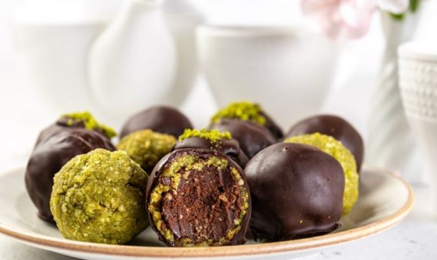 Za nugat smesu sjedinite lešnike, krem i puter i stavite u frižider da se stegne. Posebno pomešajte 75 g marcipana sa mlevenim pistaćima i od te smese formirajte kuglice prečnika 1 cm. Od ostalih 95 g marcipana napravite kuglice koje potom rastanjite tako da dobijete krug koji može da obavije kuglice od pistaća.