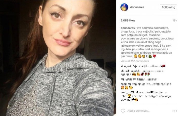 “Prva sedmica podnošljiva, druga loša, treća najbolja. Ipak, uspjela sam potpuno oživjeti, mučnine i povraćanje su glavne smetnje, umor, loša krvna slika i imunitet zbog čega izbjegavam velike grupe ljudi, 3 kilograma sam izgubila, pa vratila, sad samo jedem i spremam sam za drugu hemioterapiju za par dana“, napisala je Dona. Pratioci u fanovi su joj uputili riječi podrške.