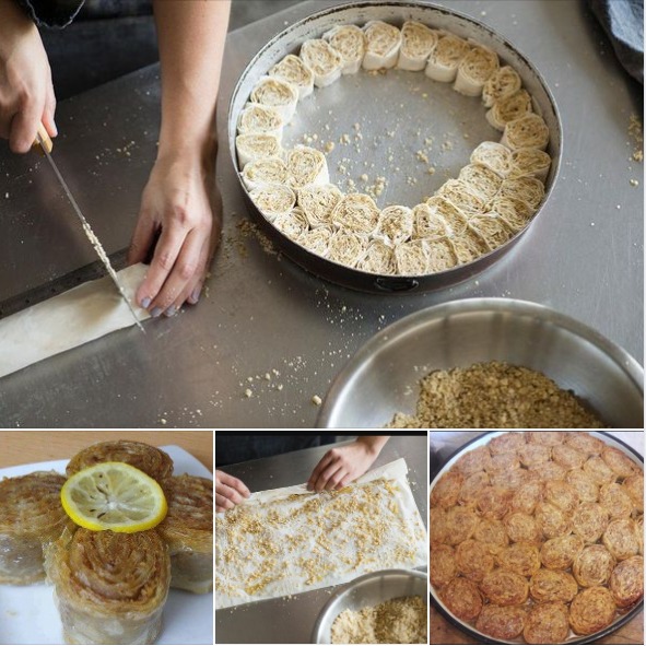 Rastopite maslac pa prve četiri kore namažite svaku posebno i složite jednu na drugu a četvrtu koru posipajte orasima i zarolajte. Nakon toga slijedeće 4 kore. Ja sam imala u pakiranju 12 kora pa su mi ispale 3 štruce.
