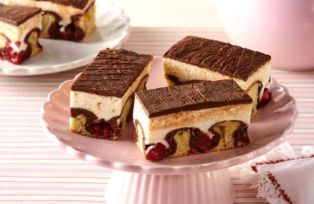 Pomalo i naizmjence u pripremljenu smjesu žutanjaka, šećera, maslaca i mlijeka dodajte brašno i snijeg. Miješajte lagano dok ne potrošite brašno i snijeg. Odvojite trećinu smjese u drugu zdjelu pa u tu trećinu dodajte kakao prah, rum i promiješajte. Kalup za pečenje premažite maslace i posipajte krušnim mrvicama pa u njega prvo ulijte svijetlu smjesu. Zatim na nju izlijte tamnu smjesu s kakaom i malo je poravnajte špatulom. Sada po cijeloj smjesi rasporedite višnje i malo ih utisnite u smjesu.