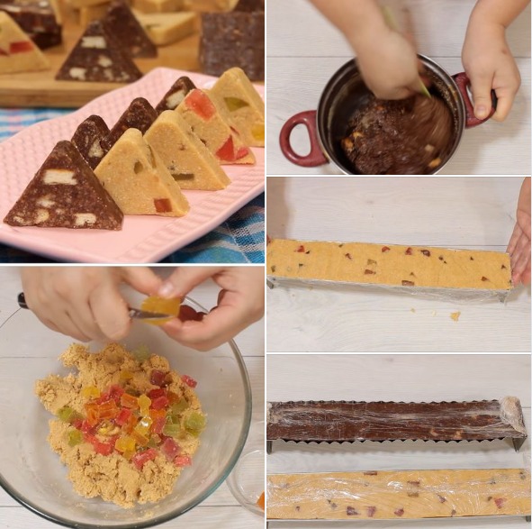 Kada se postigne idealna konzistencija smjese, koja ne smije biti ni previše gusta ni pretjerano rijetka, nastavite sa ubacivanjem žele bombona isječenih na kockice. Nakon toga, lagano ga ručno promiješajte prije nego što ga prebacite u trokutasti kalup koji je prikladno obložen fleksibilnim materijalom. U slučaju da kalup nije dostupan, moguće je oblikovati smjesu u cilindrični oblik ili kreirati pojedinačne trokute direktno na dasci za rezanje ili poslužavniku, koristeći spretnost vaših ruku.