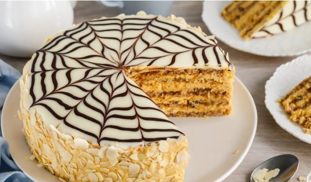 12 žumanca kuvati na pari, sa 250 g kristal šećera i 2 vanilin šećera. Kuvajte oko 15 minuta, uz stalno mešanje. Ostaviti da se ohladi pa umešati omekšani puter. Potom u fil dodati 150 g mlevenih prženih lešnika, pa sve umutiti. Kore filovati, i ređati jednu preko druge. Ostavite 3-4 kašike fila da premažete tortu okolo. Istopiti marmeladu sa kašikom vode i preliti preko četvrte kore. Staviti tortu u frižider da se marmelada malo stegne. Za glazuru izmešati, šećer, limun, ulje, vrelu vodu da bude glatko i mazivno. Premazati preko stegnute marmelade, pa odozgo, na krugu od bele čokolade uz pomoć štapića i crne čokolade, napravite čuvenu “Esterhazi šaru”. Okolo posuti krupno seckanim lešnicima.