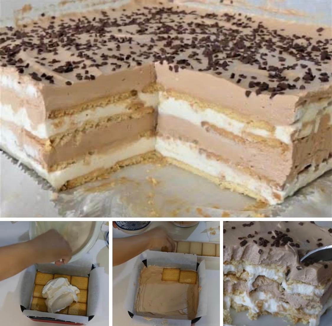 U kalup poredajte red petit keksa koji umačete u vodu, mlijeko ili sok. Potom stavljate pola bijele smjese, pa opet red keksa, zatim pola crne smjese i ponovite. Nakon što nanesete zadnji sloj crne smjese pospite čokoladnim mrvicama i stavite na hlađenje sat vremena u zamrzivaču ako vam se žuri ili da prenoći frižideru.