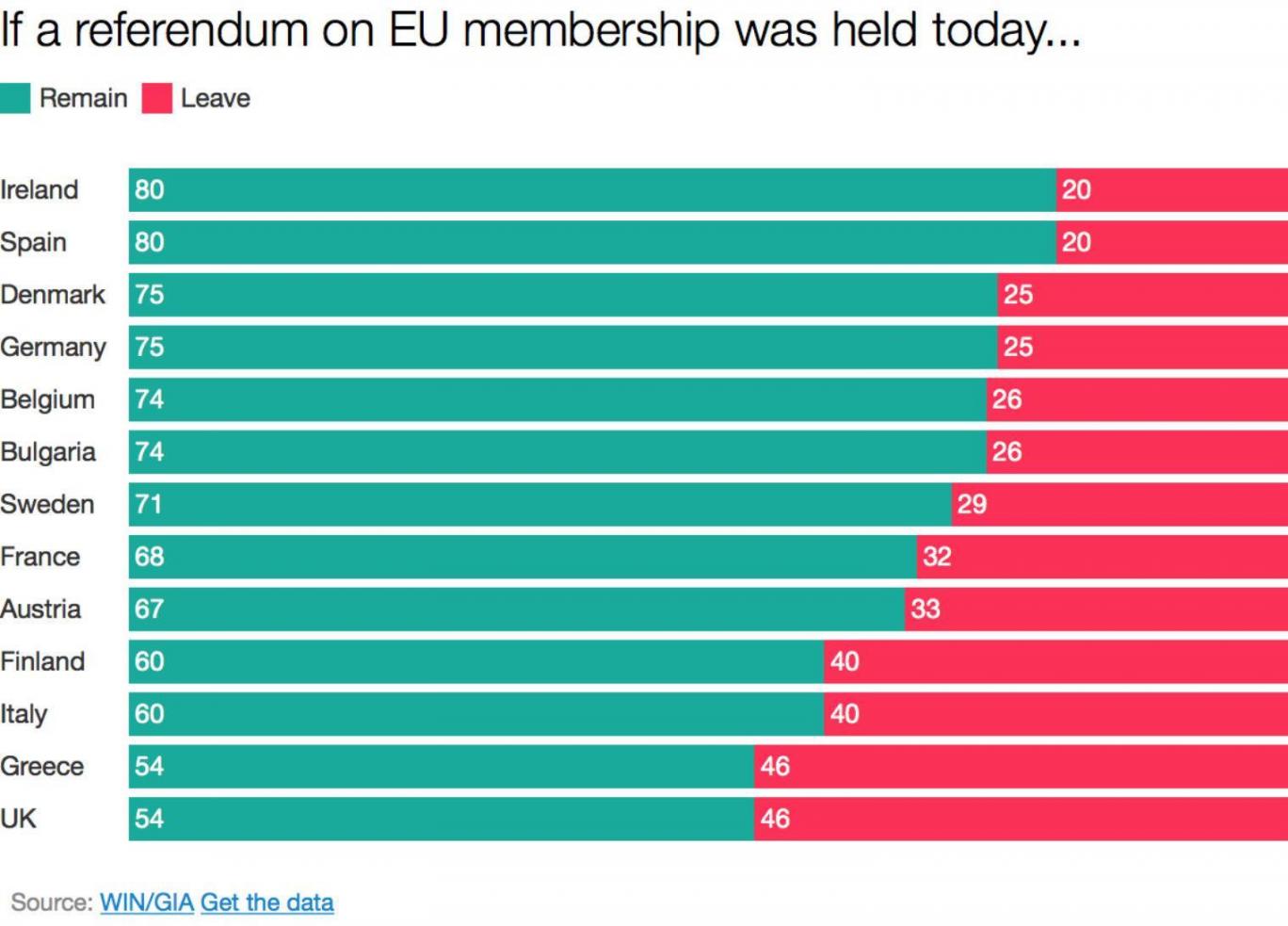 Prema podacima ove ankete, 54 posto Britanaca danas bi glasalo za ostanak u EU, a isti postotak zabilježen je u Grčkoj. Za ostanak u EU glasalo je i 60 posto Italijana i Finaca.