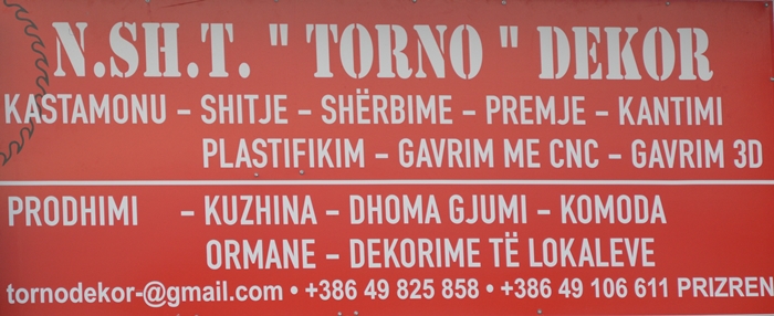 Fabrika namještaja “TORNO DEKOR” iz Prizrena je moderna fabrika koju karakteriše konstantno širenje obima i asortimana proizvodnje, kroz modernizaciju proizvodnih kapaciteta i upošljavanje novih radnika. Danas fabrika posluje u naselju “Arbana u Prizrenu a uskoro će se preseliti u novoizgradjenom, savremenom industrijskom objektu površine preko 1000 m2 sa svim pratećim sadržajima.