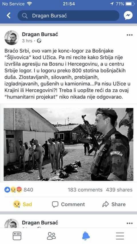 – Braćo Srbi, ovo vam je konc-logor za Bošnjake „Šljivovica“ kod Užica. Pa mi recite kako Srbija nije izvršila agresiju na Bosnu i Hercegovinu, a u centru Srbije logor. I u logoru 800 stotina bošnjačkih duša. Zlostavljanih, silovanih, prebijanih, izgladnjavanih, gušenih u kamionima… Pa nisu Užice u Krajini ili Hercegovini!? Treba li uopće reći da za ovaj „humanitarni projekat“ niko nikada nije odgovarao – napisao je Bursać.