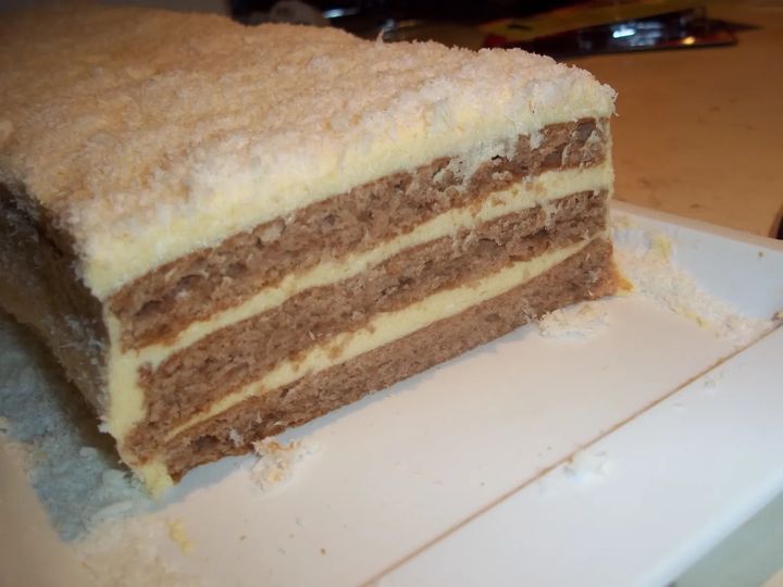 3.Ohlađeni biskvit razrežite na 6 traka (oko 6,5 cm širine). Narezane trake premažite pripremljenom kremom i složite po tri tako da dobijete 2 duguljaste štangice.4.Kolač izvana premažite kremom i na kraju pospite kokosovim brašnom.Za kremu:1.Pomiješajte prašak za puding sa šećerom, žumanjcima i malo mlijeka. Preostalo mlijeko pustite da zavrije i maknite s vatre. Umiješajte pripremljenu smjesu, vratite na vatru i kuhajte uz miješanje nekoliko minuta.2.Kremu ohladite uz povremeno miješanje. Maslac sobne temperature razradite i umiješajte u ohlađenu kremu.