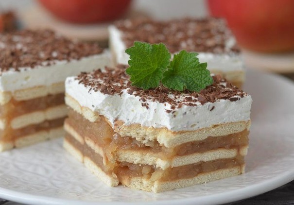 Odmah prijeđite na slaganje. U kalup dimenzija 21 x 33 cm složite petit keks bez prethodnog umakanja.Zatim rasporedite pola vruće smjese od jabuka.