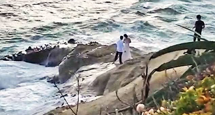 Vjenčani fotošuting pretvorio se u noćnu moru kad je ogromni val odnio mladi bračni par u vodu i životno ih ugrozio, piše Daily mail.