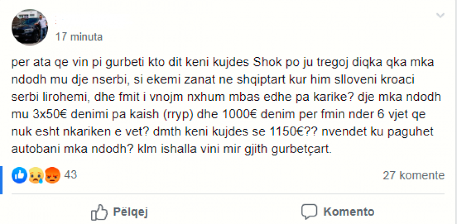 Kosovar je objasnio razloge za izricanje novčanih kazni, rekavši da je samo tri puta kažnjen sa po 50 eura zbog sigurnosnog pojasa i da je jednom sa 1 hiljadu kažnjen iz razloga što su njegova djeca mlađa od 6 godina sjedila na zadnjem sjedištu automobila bez stolice za djecu.
