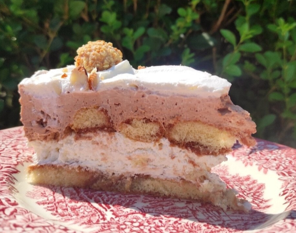 Dobivenu smjesu podijeliti na dva dijela. U jedan dodati Giotto kuglice, a u drugi čokoladni namaz.Na piškote staviti bijelu kremu, dodati još jedan sloj piškota u čokoladnom mlijeku, na piškote staviti još malo Giotto kuglica, potom smeđu kremu i na kraju vrhnje za šlag.Ukrasiti po želji.