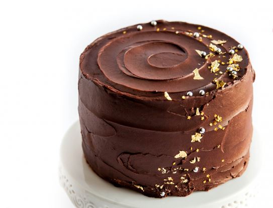 Stavite jedan biskvit na željenu podlogu i premažite ga slojem čokoladne kreme. Stavite drugi biskvit na vrh. Prelijte tortu preostalom čokoladnom kremom. Ukrasite je svježim jagodama ili malinama te pospite jestivim zlatom. Ostavite tortu da se dobro ohladi prije rezanja.