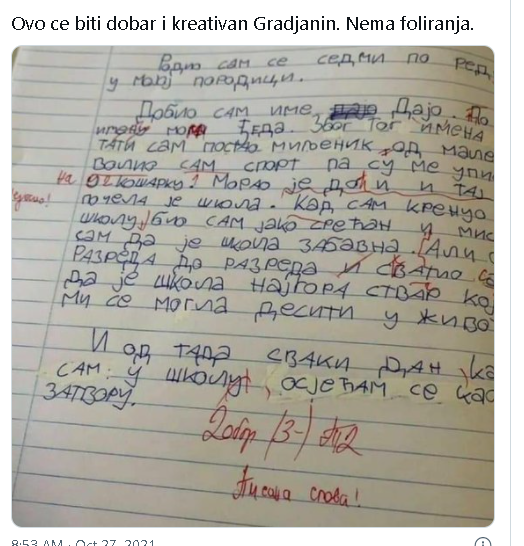 Tviteraše širom regiona nasmejao je i zabavio pismeni zadatak malog Daje na temu Moj život, moja priča u kojem je mališa najiskrenije napisao šta misli o školi onako uopšteno.