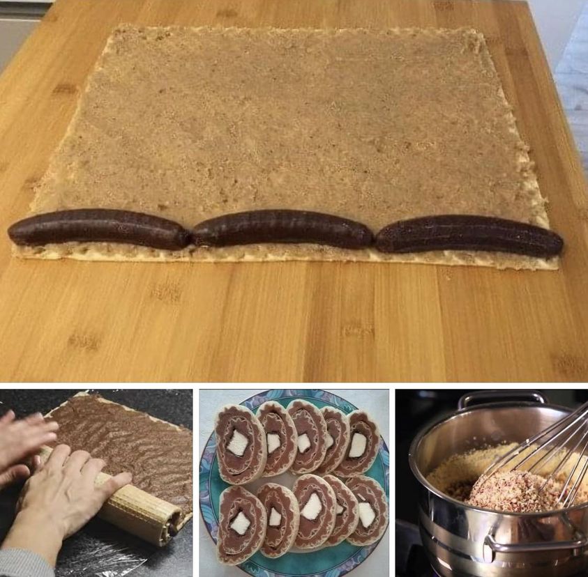 Krem bananice (čokoladne ) poslaži s jedne i druge strane po rubu oblatne i zarolaj prema sredini ( kao za mačje oči