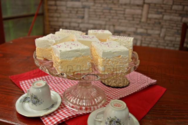 Površinu rashlađenog fila zagrebati viljuškom, a zatim naneti umućenu slatku pavlaku i ravnomerno je rasporediti.