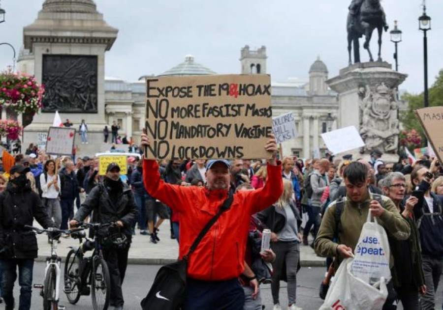 Okupili su se na Trgu Trafalgar, a protest je organizovala organizacija Stand Up X. Demonstranti se protive politici britanske vlade zbog novih mjera uvedenih zbog pandemije koronavirusa, uključujući nošenje maski, vakcinisanje i zaključavanje (lockdown).