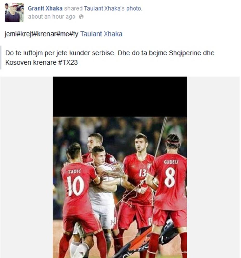 “Ponosan sam na tebe Taulante Xhaka. Doživotno ću se boriti protiv Srbije, kako bih Albaniju i Kosovo učinio ponosnim”, napisao je Granit na svojoj Fejsbuk stranici.