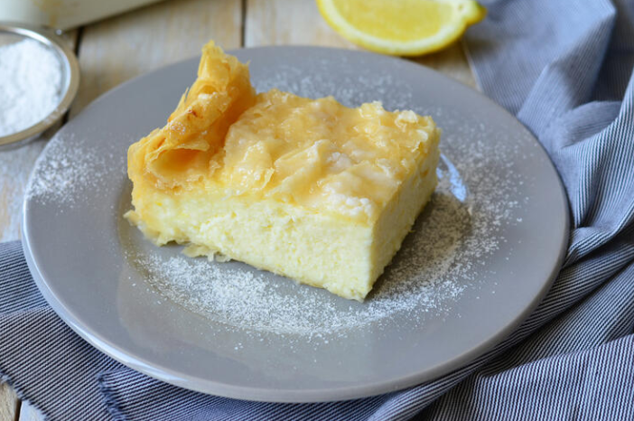 Pečen kolač sada zaseći do dna i preliti vreo kolač hladnim sirupom. Kolač nemojte prekrivati da se ne bi gornji listovi potparili, oni moraju ostati krckavi kada se kolač služi. Kolač ostaviti nekoliko sati, najbolje preko noći, da se lepo ohladi i da se sjedine ukusi.