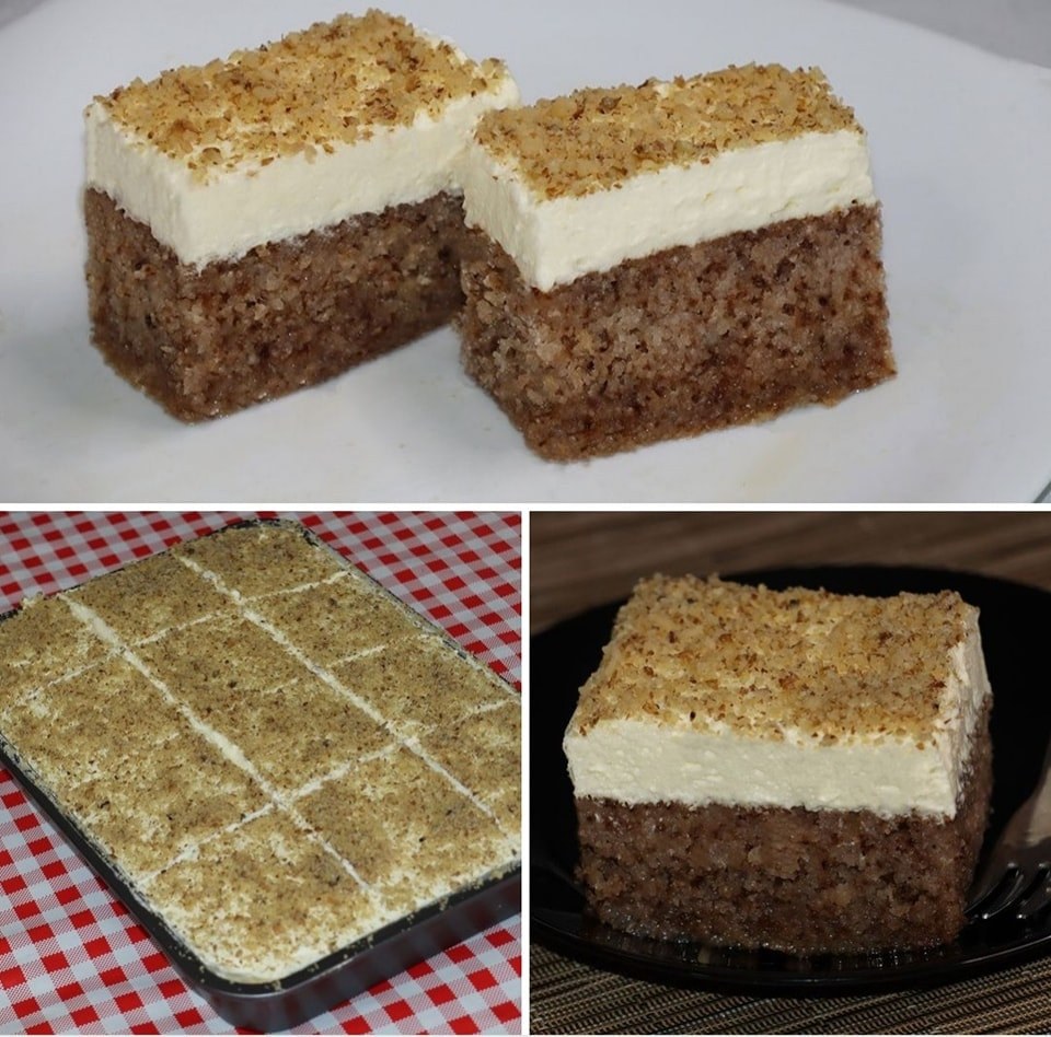 Za pripremu pomiješajte šećer i jaja, zatim dodajte ulje, mlijeko, sjeckane orahe, griz, brašno i prašak za pecivo. Smjesu dobro izmiksajte prije nego što je prebacite u namašćen i pobrašnjen kalup veličine 20×35 cm.